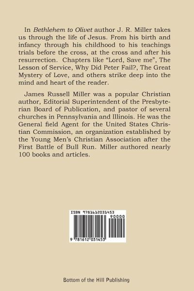 In Bethlehem to Olivet author J. R. Miller takes us through the life of Jesus. From his birth and infancy through his childhood to his teachings trials before the cross, at the cross and after his resurrection. Chapters like "Lord, Save me", The Lesson of Service, Why Did Peter Fail?, The Great Mystery of Love, and others strike deep into the mind and heart of the reader. This edition of Bethlehem to Olivet includes 30 original images. James Russell Miller was a popular Christian author, Editorial Superintendent of the Presbyterian Board of Publication, and pastor of several churches in Pennsylvania and Illinois. He was the General field Agent for the United States Christian Commission, an organization established by the Young Men's Christian Association after the First Battle of Bull Run. Miller authored nearly 100 books and articles.