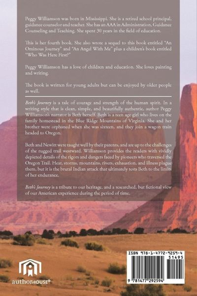 Beth's Journey is a tale of courage and strength of the human spirit. In a writing style that is clean, simple, and beautifully authentic, author Peggy Williamson's narrator is Beth herself. Beth is a teen age girl who lives on the family homestead in the Blue Ridge Mountains of Virginia. She and her brother were orphaned when she was sixteen, and they join a wagon train headed to Oregon. Beth and Newitt were taught well by their parents, and are up to the challenges of the rugged trail westward. Williamson provides the readers with vividly depicted details of the rigors and dangers faced by pioneers who traversed the Oregon Trail. Heat, storms, mountains, rivers, exhaustion, and illness plague them, but it is the brutal Indian attack that ultimately tests Beth to the limits of her endurance. Beth's Journey is a tribute to our heritage, and a researched, but fictional view of our American experience during the period of time.