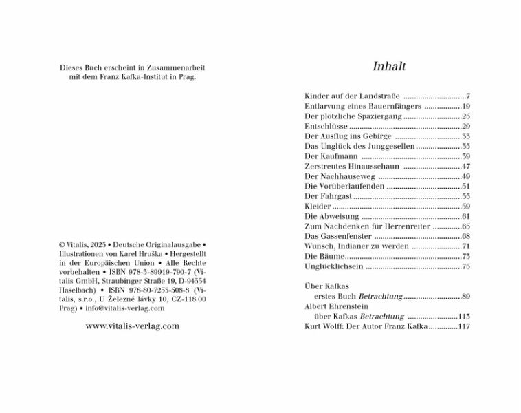 "Ich werde Ihnen immer viel dankbarer sein für die Rücksendung meiner Manuskripte als für deren Veröffentlichung", kokettiert der Prager Autor, als Verleger Kurt Wolff ein Buch mit ihm machen will. Schließlich reicht Kafka eine Sammlung exquisiter Kurzprosa ein, und schon im November 1912 liegen diese unter dem Titel Betrachtung auf den Pulten der Prager Buchhändler. Unverzüglich rückt der Schriftsteller aus, um sich einige Exemplare zu sichern: "Elf Bücher wurden bei André abgesetzt. Zehn habe ich selbst gekauft. Ich möchte nur wissen, wer das elfte hat." Mittlerweile haben unzählige weitere Exemplare die Leser in aller Welt begeistert, und längst gilt die Betrachtung als reifes Meisterwerk des noch jungen Schriftstellers. Nicht wenige sehen in Kafkas Erstling das vielleicht faszinierendste Buch, das der Dichter je verfaßt hat.