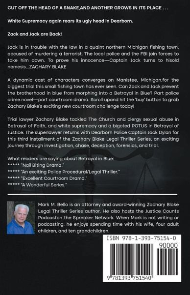 Attorney Zachary Blake returns with Police Captain Jack Dylan in this intense legal thriller. Dearborn, Michigan has enjoyed relative tranquility after beating white supremacists in the field and in the courtroom. However, a second group of dangerous bigots plots revenge for its fallen brothers. The evil plan? To steal a cache of deadly Sarin Gas and release it in Dearborn. Jack Dylan and his taskforce discover the plot and are set to diffuse it. At the last minute, the FBI usurps the investigation and achieves uncertain results. Furious with the FBI and the operation's outcome, Jack defies orders, goes rogue, and chases evil to the small fishing town of Manistee. When his own plan goes awry, Dylan finds himself under arrest and on trial for murder. Ha calls on Zack Blake to defend him in the biggest trial the community has ever seen. The local cops and the FBI are hellbent on convicting Dylan, while Blake and his team seek proof that things are not as they appear. Can Zack pull off a courtroom miracle or will Jack fall victim to a Betrayal in Blue?