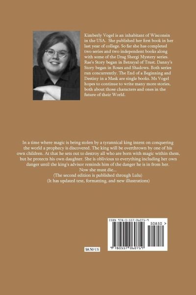 In a time where magic is being stolen by a tyrannical king intent on conquering the world a prophecy is discovered. The king will be overthrown by one of his own children. At that he sets out to destroy all who are born with magic within them, but he protects his own daughter. She is oblivious to everything including her own danger until the king's advisor reminds him of the danger he is in from her. Now she must die... (The second edition is published through Lulu with updated text, formatting, and new illustrations)