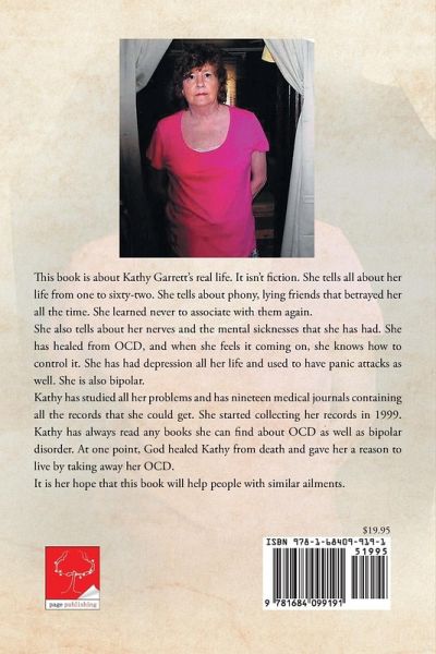 This book is about Kathy Garrett's real life. It isn't fiction. She tells all about her life from one to sixty-two. She tells about phony, lying friends that betrayed her all the time. She learned never to associate with them again. She also tells about her nerves and the mental sicknesses that she has had. She has healed from OCD, and when she feels it coming on, she knows how to control it. She has had depression all her life and used to have panic attacks as well. She is also bipolar. Kathy has studied all her problems and has nineteen medical journals containing all the records that she could get. She started collecting her records in 1999. Kathy has always read any books she can find about OCD as well as bipolar disorder. At one point, God healed Kathy from death and gave her a reason to live by taking away her OCD. Kathy is now treated by a mental doctor and takes strong medications, and it is her hope that this book will help people with similar ailments.