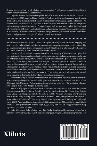 Betrayal goes to the heart of US officials' (and their partners') self-serving injury to the health and welfare of the United States and the world. US public officials' abandonment of public health for private wealth leaves the world and nation reeling from one USA-made (deliberate) crisis-of violence and disease, hunger and homelessness, deterioration and diminishment of quality conditions in workplaces and public education-to another. Their all-round acts of "legalized" corruption, their international crimes with impunity, and their deregulation-driven denial of essential needs such as clean water and air, food and work safety, shelter, and life itself constitute ultimate and everlasting betrayal. The nonfiction account in the areas of US politics, domestic affairs and foreign relations, leadership, law and democracy, and war and peace cites examples of callous, crisis-driven betrayal.