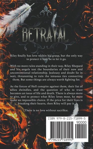 Riley finally has love within his grasp, but the only way to protect it may be to let it go. With no more rules standing in their way, Riley Shepard and his angels test the boundaries of their new and unconventional relationship. Jealousy and doubt lie in wait, threatening to ruin the tenuous ties connecting them. But some things are always worth fighting for. As the forces of Hell conspire against them, their list of allies dwindles, and the question of who to trust becomes an issue of life and death. There is always more to give, and to protect what Riley loves most, he must make an impossible choice. If the price for their lives is breaking their hearts, then Riley will pay it. There is no love without sacrifice. ***Betrayal is the fourth book in the M/M+ harem/poly romance series, Fire & Brimstone, featuring hurt/comfort, insatiable guardian angels, sizzling encounters, and an unlikely hero who comes into his own. Trigger warnings include: violence, gore, death, and off-screen sexual assault.***