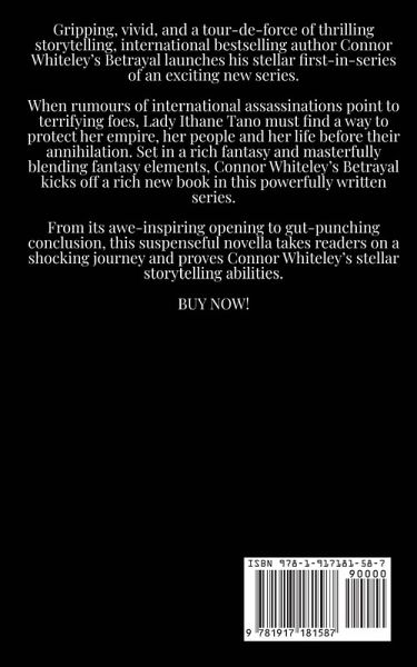 Gripping, vivid, and a tour-de-force of thrilling storytelling, international bestselling author Connor Whiteley's Betrayal launches his stellar first-in-series of an exciting new series. When rumours of international assassinations point to terrifying foes, Lady Ithane Tano must find a way to protect her empire, her people and her life before their annihilation. Set in a rich fantasy world and masterfully blending fantasy elements, Connor Whiteley's Betrayal kicks off a rich new book in this powerfully written series. From its awe-inspiring opening to gut-punching conclusion, this suspenseful novella takes readers on a shocking journey and proves Connor Whiteley's stellar storytelling abilities. BUY NOW!