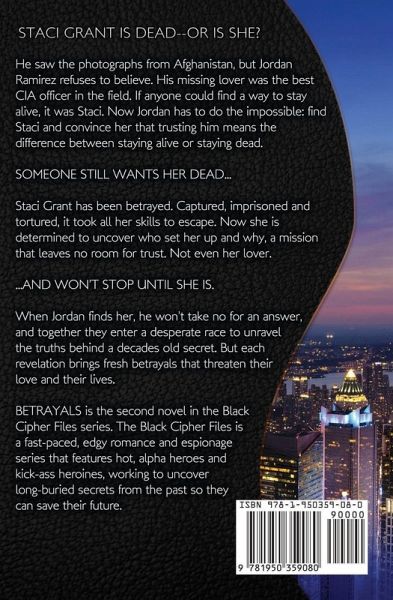 STACI GRANT IS DEAD--OR IS SHE? He saw the photographs from Afghanistan, but Jordan Ramirez refuses to believe. His missing lover was the best CIA officer in the field. If anyone could find a way to stay alive, it was Staci. Now Jordan has to do the impossible: find Staci and convince her that trusting him means the difference between staying alive or staying dead. SOMEONE STILL WANTS HER DEAD... Staci Grant has been betrayed. Captured, imprisoned and tortured, it took all her skills to escape. Now she is determined to uncover who set her up and why, a mission that leaves no room for trust. Not even her lover. ...AND WON'T STOP UNTIL SHE IS. When Jordan finds her, he won't take no for an answer, and together they enter a desperate race to unravel the truths behind a decades old secret. But each revelation brings fresh betrayals that threaten their love and their lives. Betrayals is the second novel in the Black Cipher Files series. The Black Cipher Files is an espionage and spy romance series that features hot, alpha heroes and kick-ass secret agent heroines, working to uncover long-buried secrets from the past so they can save their future. Betrayals is the story of a CIA NOC officer and a former HRT/FBI agent in a desperate race to discover who wants Staci Grant dead. Betrayals is a fast-paced, edgy romantic suspense.