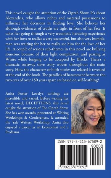 This novel caught the attention of the Oprah Show. It's about Alexandria, who allows riches and material possessions to influence her decisions in finding love. She believes lies although evidences of truths are right in front of her face. It takes her going through a very traumatic harassing experience with her boss to realize a very successful, but also very humble, man was waiting for her to see him for the love of her life. A couple of serious sub-themes in this novel are bullying someone because of their light complexion, and passing as White while longing to be accepted by Blacks. There's a dramatic runaway slave story woven throughout the main story. How the characters of both stories are related is revealed at the end of the book. The parallels of harassment between the two eras of over 150 years apart are astonishing and based on self-loathing!