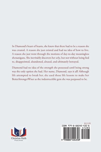 In Diamond's heart of hearts, she knew that there had to be a reason she was created. A reason she just existed and had no idea of how to live. A reason she just went through the motions of day-to-day meaningless shenanigans. She inevitably discovers her why, but not without being lied to, disappointed, abandoned, abused, and ultimately betrayed. Diamond had no idea of the strength she possessed until being strong was the only option she had. Her name, Diamond, says it all! Although life attempted to break her, she used those life lessons to make her better, stronger, wiser as the indestructible gem she was purposed to be.