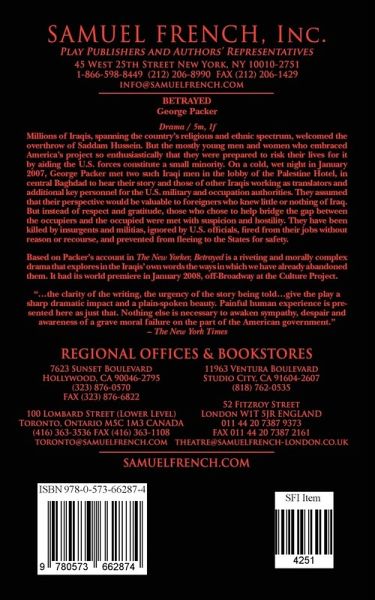 Drama / 5m, 6f Millions of Iraqis, spanning the country's religious and ethnic spectrum, welcomed the overthrow of Saddam Hussein. But the mostly young men and women who embraced America's project so enthusiastically that they were prepared to risk their lives for it by aiding the U.S. forces constitute a small minority. On a cold, wet night in January 2007, George Packer met two such Iraqi men in the lobby of the Palestine Hotel, in central Baghdad to hear their story and those of other Iraqis