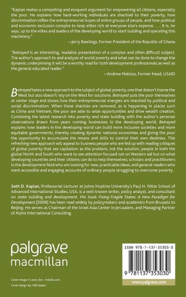 Betrayed takes a new approach to the subject of global poverty, one that doesn't blame the West but also doesn't rely on the West for solutions. Betrayed puts the poor themselves at center stage, and shows how their entrepreneurial energies are shackled by political and social discrimination. When these shackles are removed, as is happening in places such as China and Vietnam, the poor are able to seize opportunities and drive wealth creation. Combining the latest research into poverty and state building with the author's personal observations drawn from years running businesses in the developing world, Betrayed explains how leaders in the developing world can build more inclusive societies and more equitable governments, thereby creating dynamic national economies and giving the poor the opportunity to accumulate the means and skills to control their own destinies. This refreshing new approach will appeal to business people who are fed up with reading critiques of global povertythat see capitalism as the problem, not the solution; people in both the global North and South who want to see attention focused not on Western aid but on what developing countries and their citizens can do to help themselves; scholars and practitioners in the development field who are looking for new, practicable ideas; and general readers who want accessible and engaging accounts of ordinary people struggling to overcome poverty.