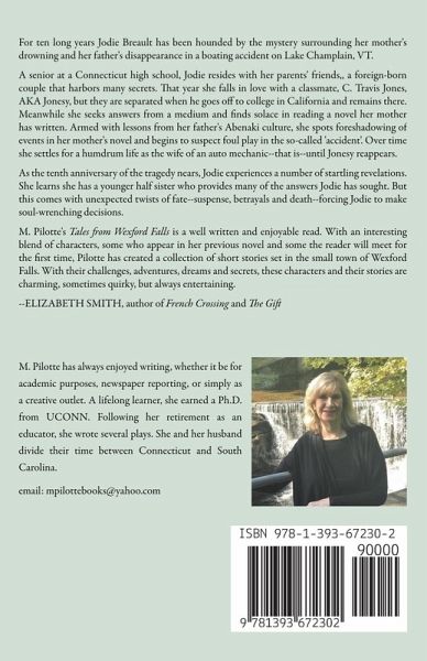 For ten long years Jodie Breault has been hounded by the mystery surrounding her mother's drowning and her father's disappearance in a boating accident on Lake Champlain, VT. A senior at a Connecticut high school, Jodie resides with her parents' friends,, a foreign-born couple that harbors many secrets. That year she falls in love with a classmate, C. Travis Jones, AKA Jonesy, but they are separated when he goes off to college in California and remains there. Meanwhile she seeks answers from a medium and finds solace in reading a novel her mother has written. Armed with lessons from her father's Abenaki culture, she spots foreshadowing of events in her mother's novel and begins to suspect foul play in the so-called 'accident'. Over time she settles for a humdrum life as the wife of an auto mechanic--that is--until Jonesy reappears. As the tenth anniversary of the tragedy nears, Jodie experiences a number of startling revelations. She learns she has a younger half sister who provides many of the answers Jodie has sought. But this comes with unexpected twists of fate--suspense, betrayals and death--forcing Jodie to make soul-wrenching decisions. M. Pilotte's Tales from Wexford Falls is a well written and enjoyable read. With an interesting blend of characters, some who appear in her previous novel and some the reader will meet for the first time, Pilotte has created a collection of short stories set in the small town of Wexford Falls. With their challenges, adventures, dreams and secrets, these characters and their stories are charming, sometimes quirky, but always entertaining. --ELIZABETH SMITH, author of French Crossing and The Gift