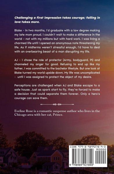 Challenging a first impression takes courage; falling in love takes more. Blake ~ In two months, I'd graduate with a law degree making my late mom proud. I couldn't wait to make a difference in the world - not with my millions but with hard work. I was living a charmed life until I opened an anonymous note threatening my life. As if midterms weren't stressful enough, I'd have to deal with an overbearing beast of a man disrupting my life. AJ ~ I chose the role of protector (Army, bodyguard, PI) and channeled my anger for good. Refusing to end up like my father, I was committed to the bachelor lifestyle. But one look at Blake turned my world upside down. My life was uncomplicated - until I was assigned to protect the object of my desire. Perceptions are challenged when AJ and Blake escape to a safe house. Just as spark start to fly, they're forced to make a decision that could separate them forever. Only a hero's courage can save them.