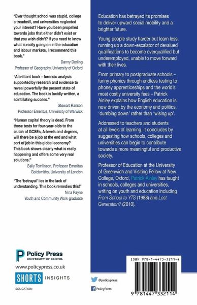 Ainley explains how English education is now driven by the economy and politics, having failed to deliver upward social mobility and a brighter future. Concludes with suggestions for positive change.