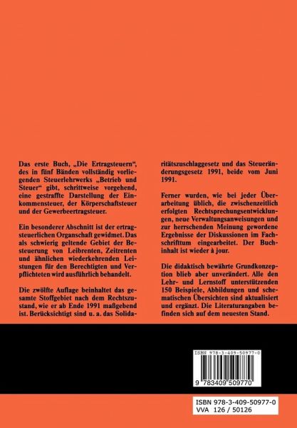 Meine Mitarbeiter am Seminar fiir Allgemeine Betriebswirtschaftslehre und Betriebswirt schaftliche Steuerlehre der UniversiHit zu KOln haben mich bei diesen Bestrebungen mit ihrem regen Interesse und mit mancherlei wertvoller Hilfe sehr unterstiitzt. Ganz besonde ren Dank schulde ich meinem Assistenten, Herrn Dipl.-Kfm. Horst Langel, fUr seine nie erlahmende Bereitschaft zu einer fundierten Sach-und Formkritik, von der dieses Buch wesentlich profitiert hat. GERDROSE Vorwort zur zw61ften Auflage Das Buch wurde fUr die zwOlfte Auflage iiberarbeitet und auf den Rechtszustand 1991 gebracht. Anderungen ergaben sich aus zahlreichen gesetzgeberischen AktivWiten, zuletzt das Solidaritiitszuschlagsgesetz (es wird in Teil 6 kurz dargestellt) und das Steueriinderungs gesetz 1991; das Steueriinderungsgesetz 1992 ist noch im Gestriipp des Gesetzgebungs verfahrens hiingengeblieben und konnte deshalb nicht eingearbeitet werden. Beriicksich tigt sind die zwischenzeitlich erfolgten Rechtsprechungsentwicklungen, neue wichtige Verwaltungsanweisungen sowie Ergebnisse der Diskussionen im Fachschrifttum. Ich habe mich auch weiter urn eine Verbesserung der sprachlichen Darstellung sowie der Aussagekraft der Beispiele bemiiht und die Literaturangaben auf den Stand yom Spiit herbst 1991 gebracht. Herzlich danke ich den Lesem, die mir durch konstruktive Vorschliige geholfen haben. Urn Verstiindnis bitte ich diejenigen unter ihnen, deren Wiinsche ich - wegen der damit sonst verbunden gewesenen Umfangsausweitungen - nicht erfiillen konnte.