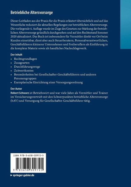 Dieser Leitfaden aus der Praxis für die Praxis erläutert übersichtlich und auf das Wesentliche reduziert die aktuellen Regelungen zur betrieblichen Altersvorsorge. Die vorliegende 4. Auflage wurde im Zuge des Gesetzes zur Stärkung der betrieblichen Altersvorsorge gründlich durchgesehen und auf den Rechtsstand Sommer 2020 aktualisiert. Das Buch ist insbesondere für Vermittler direkt vor Ort beim Kunden einsetzbar, dient aber auch Steuerberatern, Personalverantwortlichen, Geschäftsführern kleinerer Unternehmen und Freiberuflern als Einführung in die komplexe Materie sowie als handliches Nachschlagewerk.