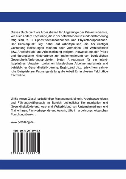 Dieses Buch dient als Arbeitsbehelf für Angehörige der Präventivdienste, wie auch andere Fachkräfte, die in der betrieblichen Gesundheitsförderung tätig sind, z. B. SportwissenschafterInnen und PhysiotherapeutInnen. Der Schwerpunkt liegt dabei auf Arbeitspausen, die bei richtiger Gestaltung Belastungen mindern oder vermeiden und Wohlbefinden bzw. Arbeitsfreude und Arbeitsleistung steigern. Hinweise aus der Praxis und theoretische Hintergründe zur Implementierung von betrieblichen Gesundheitsförderungsprojekten bieten Anregungen für ein interdisziplinäres Vorgehen zwischen klassischem Arbeitnehmerschutz und betrieblicher Gesundheitsförderung. Ergänzend dazu erleichtern zahlreiche Beispiele zur Pausengestaltung die Arbeit für in diesem Feld tätige Fachkräfte.