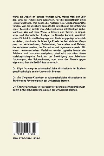 Vorwort.- Vorbemerkung und Danksagung.- inleitung: Forschen aus der Erlebnisperspektive.- 1. Einige Informationen und Daten zum Betrieb und seiner Geschichte.- 2. Das empirische Vorgehen im Untersuchungsbetrieb.- 3. Ein Forschungsseminar mit Arbeiterinnen - ein Beispiel für die Erhebung.- Erlebnisperspektiven der Vorgesetzten in der Fertigung.- I. Das Bild der Vorarbeiter und Meister von ihrer Arbeitsaufgabe.- II. Das Bild der Vorarbeiter und Meister vom Umgang mit ihren Untergebenen.- III. Die Vorstellungen der Vorarbeiter und Meister von ihrer beruflichen Zukunft.- Humanisierungsbarrieren und Humanisierungsbedürfnisse der Vorgesetzten in der Fertigung.- 1. 'Wir leiden am meisten unter dem Fehlstand'.- 2. 'Es liegt, glaube ich, auch an den Leuten selber'.- 3. 'Das ist ja das Komische, daß die qualifizierten Arbeitsplätze wenig Fehlzeiten haben'.- 4. 'Ne Frauengruppe und ohne Aufsicht, wie soll das denn laufen'.- Erlebnisperspektiven der Facharbeiter.- I. Das Bild der Facharbeiter von der Bewältigung ihrer Arbeitsvorgaben.- II. Das Bild der Facharbeiter von der Zusammenarbeit in der Produktion.- III. Das Bild der Facharbeiter von der Zukunft ihrer Arbeit.- Humanisierungsbarrieren und Humanisierungsbedürfnisse der Facharbeiter.- 1. 'Wir müssen ja auch nur jetzt' ne Möglichkeit finden, den Arbeitsplatz zu verschönern'.- 2. 'Was ganz wichtig wäre, das wäre zum Beispiel, daß die oben anders sind'.- 3. 'Wir haben da keinerlei Einfluß drauf.- Erlebnisperspektiven der Ungelernten.- I. Das Bild der ungelernten Arbeiterinnen von der Bewältigung ihrer Arbeitsvorgaben.- II. Das Bild der ungelernten Arbeiterinnen von der Zusammenarbeit in der Fertigung.- III. Die Vorstellungen ungelernter Arbeiterinnen von der Zukunft ihrer Arbeit.-Humanisierangsbarrieren und Humanisierungsbedürfnisse der Ungelernten.- 1. 'Vielleicht könnte man da noch eine Frau zwischensetzen'.- 2. 'Arbeitsplatzwechsel, das bringt eigentlich auch nicht viel'.- 3. 'Ein Lehrgang, das war 'ne Erschwernis für die Frau'.- Exkurs: Das Bild ausländischer Kolleginnen in der Vorstellung ihrer deutschen Arbeitsnachbarinnen.- 1. 'Zu damaliger Zeit, da waren wir ja auch kaum Ausländer'.- 2. 'Ausländer, das ist ein Haufen für sich, die wollen nur Geld haben'.- 3. 'Ausländer brauchen da nicht hin, wo wir hin müssen'.- Erlebnisperspektiven der Lohnschreiberinnen.- Erlebnisperspektiven der Arbeitsvorbereiter.- I. Das Bild der Arbeitsvorbereiter von ihrer Stellung im Betrieb.- II. Die Vorstellungen der Arbeitsvorbereiter von ihren Rationalisierungsaufgaben und von der Zukunft der Arbeit.- Humanisierungsbarrieren und Humanisierungsbedürfnisse der Arbeitsvorbereiter.- 1. 'Das System muß ja dann irgendwie in Betrieb genommen werden'.- 2. 'Wenn ich das so wieder sehe, ganz nüchtern, das ist' ne einfache Tätigkeit'.- 3. 'Privatgespräche gegen Monotonie, das halte ich von der Wirklichkeit her etwas fragwürdig'.- 4. 'Bei einer Aufteilung in Einzelplätze würde ich eine bessere Leistung erzielen'.- Erlebnisperspektiven der Ingenieure und Techniker.- I. Die beruflichen Ansprüche der Ingenieure und Techniker.- II. Das Bild der Ingenieure und Techniker von ihrer Entwicklungsaufgabe im Produktionsproze?.- III. Die Vorstellungen der Ingenieure und Techniker von ihrer beruflichen Zukunft.- Humanisierungsbarrieren und Humanisierungsbedürfnisse der Ingenieure und Techniker.- 1. 'Das ist wieder das Arbeitgeberdenken, man ist da so richtig drin'.- 2. 'Mir sträubt sich auch einiges gegen diesengesamten Arbeitsplatz'.- 3. 'Denn wir wissen ja nicht, wie den Leuten zumute ist'.- Exkurs: Die Kognitive Gestalt des Problemlösens in Humanisierungsdis-kussionen bei Ingenieuren und Technikern im Vergleich zu ungelernten Arbeiterinnen.- 1. Problemfindung nach Ausnahmeregeln.- 2. Problemfindung nach den Regeln des Topos.- 3. Vergleich der Problemlösungen: Entlastung von Anstrengungen - Verwirklichung von Ansprüchen.- Subjektivität im Produktionsprozeß.- 1. Sinn der Arbeit als identitätsstiftendes Moment im Arbeitsbewußtsein.- 2. Herstellen, Handeln, Sprechen und Arbeiten.- 3. Betriebliche Lebenswelt, ein Untersuchungsfeld der Sozialpsychologie.- Auswertungsverfahren im Interpretativen Paradigma.- 1. Gültigkeitskriterien einer qualitativen Forschung.- 2. Die Methode der Kernsatzfindung und die Modi des hermeneutischen Verstehens.- Anmerkungen und Literaturhinweise zu den einzelnen Kapiteln.- Literatur.