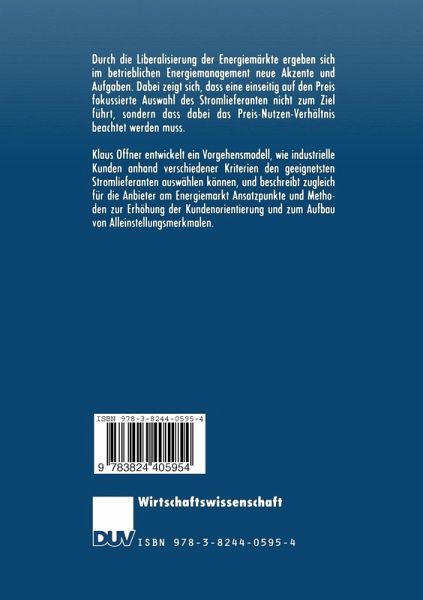 Klaus Offner entwickelt ein Vorgehensmodell, wie industrielle Kunden anhand verschiedener Kriterien den geeignetsten Stromlieferanten auswählen können, und beschreibt zugleich für die Anbieter am Energiemarkt Ansatzpunkte und Methoden zur Erhöhung der Kundenorientierung und zum Aufbau von Alleinstellungsmerkmalen.