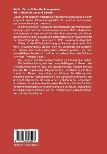Dieses Lehrbuch führt in den Bereich des Rechnungswesens ein, dem aufgrund seines Informationsgehaltes für externe Interessenten besondere Bedeutung zukommt. In der nun zweiten Auflage werden neben der eigentlichen Buchführung - jetzt nach dem Industriekontenrahmen 1986 - die handels- und steuerrechtlichen Vorschriften des Bilanzansatzes, des Jahresabschlusses und der Bewertung auf Basis des neuen HGB und unter Berücksichtigung der Steuerreform 1990 umfassend dargestellt. Weiter ist die EDV-Buchführung im Rahmen allgemeiner Software-Anwendungen zu großen Teilen neu aufbereitet und zusätzlich im Rahmen der Buchungstechniken erläutert worden. Das Software-Beispiel bezieht sich auf den aktuellsten Stand der Software "rhvFibu - Version V2.01". Neu ist auch das Stichwortverzeichnis im Anhang des Buches. Die Veröffentlichung soll den Leser befähigen, im Bereich der Finanzbuchhaltung mit EDV, der entsprechenden Programmierung oder der DV-Organisation tätig zu werden. Einsetzbar ist das Buch sowohl im Bereich Ausbildung an höheren Berufsfachschulen (einschließlich der Fachoberschulen und Wirtschaftsgymnasien) und an Fachhochschulen, als auch in der Fortbildung an Fachschulen. Im letzteren Bereich werden die ersten Abschnitte über die Buchführungsmethoden gern zur Wiederholung und Vertiefung nachgearbeitet. Selbstverständlich bietet sich die Unterlage auch als Nachschlagewerk für den Praktiker an.