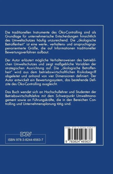 Die traditionellen Instrumente des Öko-Controlling sind als Grundlage für unternehmerische Entscheidungen hinsichtlich des Umweltschutzes häufig unzureichend. Die "ökologische Betroffenheit" ist eine werte-, verhaltens- und anspruchsgruppenorientierte Größe, die auf Informationen traditioneller Bewertungsverfahren aufbaut. Der Autor erläutert mögliche Verhaltensweisen des betrieblichen Umweltschutzes und zeigt maßgebliche Variablen der strategischen Ausrichtung auf. Die "ökologische Betroffenheit" wird aus dem betriebswirtschaftlichen Risikobegriff abgeleitet und anhand von vier Dimensionen definiert. Der Autor entwickelt ein Bewertungssystem, das bestehende Defizite des Öko-Controlling ausgleicht.
