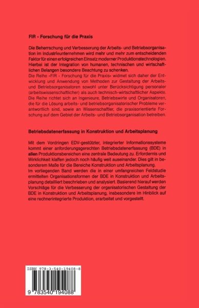 Mit dem Vordringen EDV-gestützter, integrierter Informationssysteme kommt einer anforderungsgerechten Betriebsdatenerfassung (BDE) in allen Produktionsbereichen eine zentrale Bedeutung zu. Erfordernis und Wirklichkeit klaffen jedoch noch häufig weit auseinander. Dies gilt in besonderem Maße für die Bereiche Konstruktion und Arbeitsplanung. Im vorliegenden Band werden die in einer umfangreichen Feldstudie ermittelten Organisationsformen der BDE in Konstruktion und Arbeitsplanung detailliert beschrieben und systematisch analysiert. Basierend hierauf werden Vorschläge für die Verbesserung der organisatorischen Gestaltung der BDE in Konstruktion und Arbeitsplanung, insbesondere im Hinblick auf eine rechnerintegrierte Produktion, erarbeitet und vorgestellt.