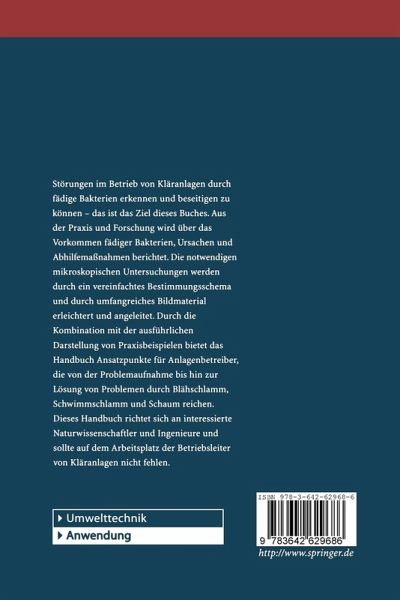 Störungen im Betrieb der Kläranlagen zu erkennen und beseitigen zu können - das ist das Ziel dieser Veröffentlichung. Anhand sehr guter, überwiegend vierfarbiger Abbildungen werden Erscheinungsformen fädiger Bakterien erkennbar, die notwendigen mikroskopischen Untersuchungen werden durch ein vereinfachtes Bestimmungsschema erleichtert und angeleitet. Ausführliche Praxisbeispiele erläutern die Zusammenhänge und geben Hilfestellung und Ansatzpunkte bei Problemen. Dieses Handbuch gehört auf den Arbeitsplatz des Betriebsleiters von Kläranlagen.