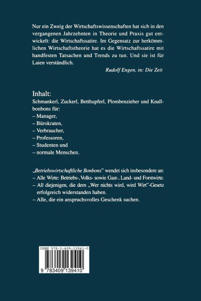 Noch nie etwas von -Betriebswirtschaftlichen Bonbons- gehört? Verständlich, denn die vorliegende Mischung stellt ein Unikum auf dem Schmankerl-Markt dar: Zuckerl, Betthupferl, Plombenzieher und Knallbonbons für Manager, Bürokraten, Verbraucher, Professoren, Studenten und normale Menschen. Für das Rezept wurden vielerlei Zutaten aus Tageszeitungen und anderer Literatur ausgewählt. Die Mixtur würzen viele akademische Anekdoten und Beitrage aus fremder und eigener Küche.