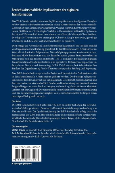 Die Beiträge der Arbeitskreise sind fünf Bereichen zugeordnet: Teil I ist dem Wandel von Organisation und Führung gewidmet. In Teil II kommen drei Arbeitskreise zu Wort, die sich mit den Folgen der durch die fortschreitende Digitalisierung induzierten Veränderungen der Wertschöpfungsprozesse auseinandersetzen. Business Model Innovations und die Transformation ganzer Branchen stehen im Mittelpunkt von Teil III des Sonderhefts. Teil IV beinhaltet