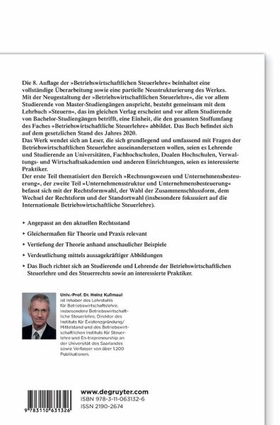 Die 8. Auflage der »Betriebswirtschaftlichen Steuerlehre« beinhaltet eine vollständige Überarbeitung sowie eine partielle Neustrukturierung des Werkes. Mit der Neugestaltung der »Betriebswirtschaftlichen Steuerlehre«, die vor allem Studierende von Master-Studiengängen anspricht, besteht gemeinsam mit dem Lehrbuch »Steuern«, das im gleichen Verlag erscheint und vor allem Studierende von Bachelor-Studiengängen betrifft, eine Einheit, die den gesamten Stoffumfang des Faches »Betriebswirtschaftliche Steuerlehre« abbildet. Das Buch befindet sich auf dem gesetzlichen Stand des Jahres 2020.