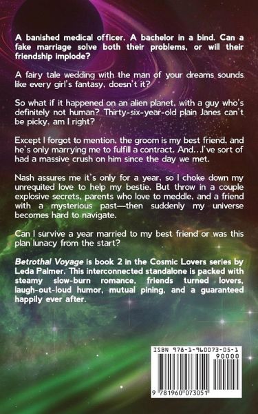 A banished medical officer. A bachelor in a bind. Can a fake marriage solve both their problems, or will their friendship implode? A fairy tale wedding with the man of your dreams sounds like every girl's fantasy, doesn't it? So what if it happened on an alien planet, with a guy who's definitely not human? Thirty-six-year-old plain Janes can't be picky, am I right? Except I forgot to mention, the groom is my best friend, and he's only marrying me to fulfill a contract. And...I've sort of had a massive crush on him since the day we met. Nash assures me it's only for a year, so I choke down my unrequited love to help my bestie. But throw in a couple explosive secrets, parents who love to meddle, and a friend with a mysterious past-then suddenly my universe becomes hard to navigate. Can I survive a year married to my best friend or was this plan lunacy from the start? Betrothal Voyage is book 2 in the Cosmic Lovers series by Leda Palmer. This interconnected standalone is packed with steamy slow-burn romance, friends turned lovers, laugh-out-loud humor, mutual pining, and a guaranteed happily ever after.