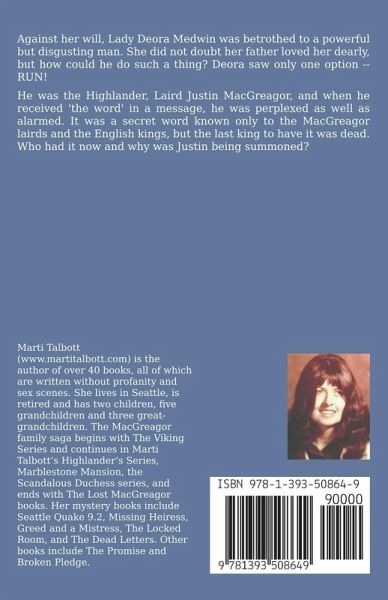 Against her will, Lady Deora Medwin was betrothed to a powerful but disgusting man. She did not doubt her father loved her dearly, but how could he do such a thing? Deora saw only one option -- RUN! He was the Highlander, Laird Justin MacGreagor, and when he received 'the word' in a message, he was perplexed as well as alarmed. It was a secret word known only to the MacGreagor lairds and the English kings, but the last king to have it was dead. Who had it now and why was Justin being summoned?