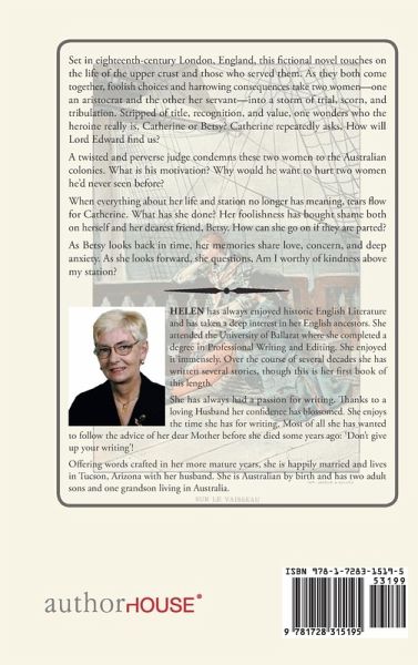 Set in eighteenth-century London, England, this fictional novel touches on the life of the upper crust and those who served them. As they both come together, foolish choices and harrowing consequences take two women-one an aristocrat and the other her servant-into a storm of trial, scorn, and tribulation. Stripped of title, recognition, and value, one wonders who the heroine really is, Catherine or Betsy? Catherine repeatedly asks, How will Lord Edward find us? A twisted and perverse judge condemns these two women to the Australian colonies. What is his motivation? Why would he want to hurt two women he'd never seen before? When everything about her life and station no longer has meaning, tears flow for Catherine. What has she done? Her foolishness has bought shame both on herself and her dearest friend, Betsy. How can she go on if they are parted? As Betsy looks back in time, her memories share love, concern, and deep anxiety. As she looks forward, she questions, Am I worthy of kindness above my station?