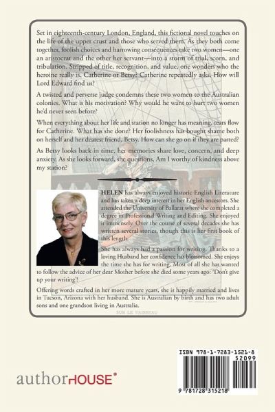 Set in eighteenth-century London, England, this fictional novel touches on the life of the upper crust and those who served them. As they both come together, foolish choices and harrowing consequences take two women-one an aristocrat and the other her servant-into a storm of trial, scorn, and tribulation. Stripped of title, recognition, and value, one wonders who the heroine really is, Catherine or Betsy? Catherine repeatedly asks, How will Lord Edward find us? A twisted and perverse judge condemns these two women to the Australian colonies. What is his motivation? Why would he want to hurt two women he'd never seen before? When everything about her life and station no longer has meaning, tears flow for Catherine. What has she done? Her foolishness has bought shame both on herself and her dearest friend, Betsy. How can she go on if they are parted? As Betsy looks back in time, her memories share love, concern, and deep anxiety. As she looks forward, she questions, Am I worthy of kindness above my station?