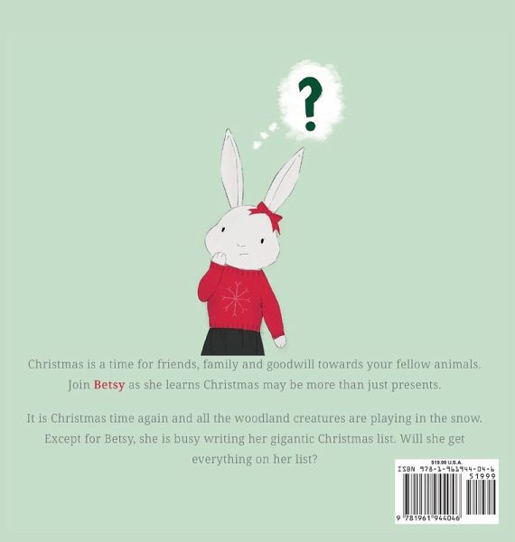 Christmas is a time for friends, family and goodwill towards your fellow animals. Join Betsy as she learns Christmas may be more than just presents. It is Christmas time again and all the woodland creatures are playing in the snow. Except for Betsy, she is busy writing her gigantic Christmas list. Will she get everything on her list? Join Betsy and her woodland friends on their many adventures in The Woodland Hollow Adventures series.