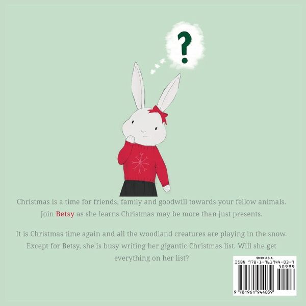 Christmas is a time for friends, family and goodwill towards your fellow animals. Join Betsy as she learns Christmas may be more than just presents. It is Christmas time again and all the woodland creatures are playing in the snow. Except for Betsy, she is busy writing her gigantic Christmas list. Will she get everything on her list? Join Betsy and her woodland friends on their many adventures in The Woodland Hollow Adventures series.