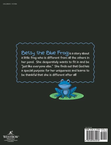 Betsy the Blue Frog is a story about a little frog who is different from all the others in her pond. She desperately wants to fit in and be "just like everyone else." She finds out that God has a special purpose for her uniqueness and learns to be thankful that she is different after all!