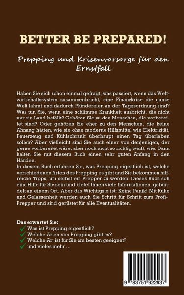 Haben Sie sich schon einmal gefragt, was passiert, wenn das Weltwirtschaftssystem zusammenbricht, eine Finanzkrise die ganze Welt lähmt und dadurch Plündereien an der Tagesordnung sind? Was tun Sie, wenn eine schlimme Krankheit ausbricht, die nicht nur ein Land befällt? Gehören Sie zu den Menschen, die vorbereitet sind? Oder gehören Sie eher zu den Menschen, die keine Ahnung hätten, wie sie ohne moderne Hilfsmittel wie Elektrizität, Feuerzeug und Kühlschrank überhaupt einen Tag überleben sollen? Aber vielleicht sind Sie auch einer von denjenigen, der gerne vorbereitet wäre, aber noch nicht so richtig weiß, wie. Dann halten Sie mit diesem Buch einen sehr guten Anfang in den Händen. In diesem Buch erfahren Sie, was Prepping eigentlich ist, welche verschiedenen Arten des Prepping es gibt und Sie bekommen hilfreiche Tipps, um selbst ein Prepper zu werden. Dieses Buch soll eine Hilfe für Sie sein und bietet Ihnen viele Informationen, gebündelt an einem Ort. Aber das Wichtigste ist: Keine Panik! Mit Ruhe und Gelassenheit werden auch Sie Schritt für Schritt zum Profi-Prepper und sind gerüstet für alle Eventualitäten. Das erwartet Sie:-Was ist Prepping eigentlich?-Welche Arten von Prepping gibt es?-Welche Art ist für Sie am besten geeignet?-und vieles mehr ...