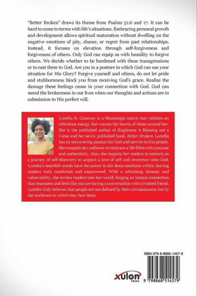 "Better Broken" draws its theme from Psalms 51:6 and 17. It can be hard to come to terms with life's situations. Embracing personal growth and development allows spiritual maturation without dwelling on the negative emotions of pity, shame, or regret from past relationships. Instead, it focuses on elevation through self-forgiveness and forgiveness of others. Only God can equip us with humility to forgive others. We decide whether to be burdened with these transgressions or to cast them to God. Are you in a posture in which God can use your situation for His Glory? Forgive yourself and others, do not let pride and stubbornness block you from receiving God's grace. Realize the damage these feelings cause in your connection with God. God can mend the brokenness in our lives when our thoughts and actions are in submission to His perfect will. Lycedia R. Gasaway is a Mississippi native that radiates an infectious energy that warms the hearts of those around her. She is the published author of Singleness A Blessing not a Curse and her newly published book, Better Broken. Lycedia has an unwavering passion for God and service to His people. She compels her audience to embrace a life filled with purpose and authenticity. Also, she inspires her readers to embark on a journey of self-discovery to acquire a love of self and reverence unto God. Lycedia's heartfelt words have the power to stir deep emotions within, leaving readers both comforted and empowered. With a refreshing honesty and vulnerability, she invites readers into her world, forging an instant connection that resonates and feels like you are having a conversation with a trusted friend. Lycedia truly believes that people are not defined by their circumstances but by the resilience in which they face them.