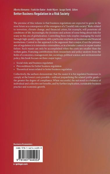 The premise of this volume is that business regulations are expected to grow in the near future as a consequence of the emergence of a "(world) risk society." Risks related to terrorism, climate change, and financial crises, for example, will penetrate all conditions of life. Increasingly, the decisions and actions of some bring about risks for many in this era of globalization. Controlling these risks implies managing the world through high-quality regulation, with a particular emphasis on businesses and financial institutions. Central to this approach is the argument that a major, if not the primary, aim of regulation is to internalize externalities, or in a broader context, to repair market failure. Such repair can only be accomplished when the costs are smaller than the welfare gains.Featuring contributions from researchers and policy analysts from the fields of economics, management, law, sociology, political science, and environmental policy, this book focuses on three major topics:-Social risks and business regulation-Preconditions for better business regulation-Theoretical issues related to better business regulationCollectively, the authors demonstrate that the easier it is for regulated businesses to comply at the lowest costs possible-without jeopardizing the related public goals-the greater the degree of compliance. When successful, the net result is a balance of individual and collective net benefits, and by further implication, sustainable business practice and economic growth.