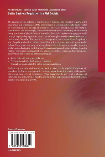 The premise of this volume is that business regulations are expected to grow in the near future as a consequence of the emergence of a "(world) risk society." Risks related to terrorism, climate change, and financial crises, for example, will penetrate all conditions of life. Increasingly, the decisions and actions of some bring about risks for many in this era of globalization. Controlling these risks implies managing the world through high-quality regulation, with a particular emphasis on businesses and financial institutions. Central to this approach is the argument that a major, if not the primary, aim of regulation is to internalize externalities, or in a broader context, to repair market failure. Such repair can only be accomplished when the costs are smaller than the welfare gains.Featuring contributions from researchers and policy analysts from the fields of economics, management, law, sociology, political science, and environmental policy, this book focuses on three major topics:-Social risks and business regulation-Preconditions for better business regulation-Theoretical issues related to better business regulationCollectively, the authors demonstrate that the easier it is for regulated businesses to comply at the lowest costs possible-without jeopardizing the related public goals-the greater the degree of compliance. When successful, the net result is a balance of individual and collective net benefits, and by further implication, sustainable business practice and economic growth.