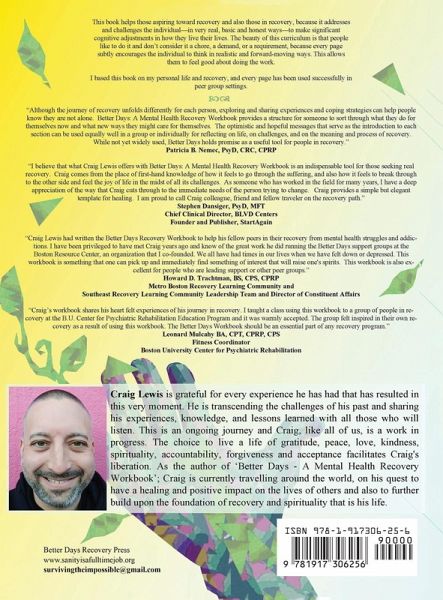 This book helps those aspiring toward recovery and also those in recovery, because it addresses and challenges the individual-in very real, basic and honest ways to make significant cognitive adjustments in how they live their lives. The beauty of this curriculum is that people like to do it and don't consider it a chore, a demand, or a requirement, because every page subtly encourages the individual to think in realistic and forward-moving ways. This allows them to feel good about doing the work. I based this book on my personal life and recovery, and every page has been used successfully in peer group settings. "Although the journey of recovery unfolds differently for each person, exploring and sharing experiences and coping strategies can help people know they are not alone. Better Days: A Mental Health Recovery Workbook provides a structure for someone to sort through what they do for themselves now and what new ways they might care for themselves. The optimistic and hopeful messages that serve as the introduction to each section can be used equally well in a group or individually for reflecting on life, on challenges, and on the meaning and process of recovery. While not yet widely used, Better Days holds promise as a useful tool for people in recovery." Patricia B. Nemec, PsyD, CRC, CPRP "I believe that what Craig Lewis offers with Better Days: A Mental Health Recovery Workbook is an indispensable tool for those seeking real recovery. Craig comes from the place of first-hand knowledge of how it feels to go through the suffering, and also how it feels to break through to the other side and feel the joy of life in the midst of all its challenges. As someone who has worked in the field for many years, I have a deep appreciation of the way that Craig cuts through to the immediate needs of the person trying to change. Craig provides a simple but elegant template for healing. I am proud to call Craig colleague, friend and fellow traveler on the recovery path." Stephen Dansiger, PsyD, MFT Chief Clinical Director, BLVD Centers Founder and Publisher, StartAgain "Craig Lewis had written the Better Days Recovery Workbook to help his fellow peers in their recovery from mental health struggles and addictions. I have been privileged to have met Craig years ago and know of the great work he did running the Better Days support groups at the Boston Resource Center, an organization that I co-founded. We all have had times in our lives when we have felt down or depressed. This workbook is something that one can pick up and immediately find something of interest that will raise one's spirits. This workbook is also excellent for people who are leading support or other peer groups." Howard D. Trachtman, BS, CPS, CPRP Metro Boston Recovery Learning Community and Southeast Recovery Learning Community Leadership Team and Director of Constituent Affairs "Craig's workbook shares his heart felt experiences of his journey in recovery. I taught a class using this workbook to a group of people in recovery at the B.U. Center for Psychiatric Rehabilitation Education Program and it was warmly accepted. The group felt inspired in their own recovery as a result of using this workbook. The Better Days Workbook should be an essential part of any recovery program." Leonard Mulcahy BA, CPT, CPRP, CPS Fitness Coordinator Boston University Center for Psychiatric Rehabilitation