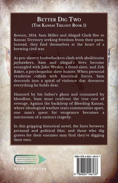 Boston, 1854. Sam Miller and Abigail Clark flee to Kansas Territory seeking freedom from their pasts. Instead, they find themselves at the heart of a brewing civil war. As pro-slavery bushwhackers clash with abolitionist jayhawkers, Sam and Abigail's lives become entangled with John Wesley, a freed slave, and Zeb Baker, a psychopathic slave hunter. When personal vendettas collide with historical forces, Sam descends into a spiral of violence that threatens everything he holds dear. Haunted by his father's ghost and consumed by bloodlust, Sam must confront the true cost of revenge. Against the backdrop of Bleeding Kansas, where ideological warfare tears communities apart, one man's quest for vengeance becomes a microcosm of a nation's tragedy. In this gripping historical novel, the lines between personal and political blur, and those who dig graves for their enemies may find they're digging their own.