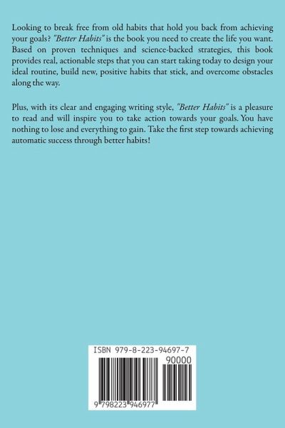 Do you ever find yourself struggling to break free from old habits that hold you back from achieving your goals? Whether it's procrastination, lack of motivation, or just feeling stuck in a rut, we've all been there. It can be frustrating and overwhelming, but there is a solution. "Better Habits" is the book you need to finally create the life you want. Imagine being able to design a routine that fits your unique needs and goals, and building new, positive habits that stick effortlessly. With "Better Habits", you'll learn how to do just that. This isn't your typical self-help book that's heavy on theory and light on practical advice. "Better Habits" provides you with real, actionable steps that you can start taking today to transform your life. You'll learn the science behind habit formation and how to use it to your advantage, and discover strategies for breaking free from old patterns that no longer serve you. But what sets "Better Habits" apart from other books on the topic? It's based on proven techniques that have helped thousands of people just like you achieve automatic success through better habits. And it's not a one-size-fits-all approach. You'll learn how to design your ideal routine that fits your unique needs and goals, and discover tips for staying motivated and overcoming obstacles along the way. Inside "Better Habits", you'll find:Science-backed strategies for creating better habits Step-by-step guidance for breaking old patterns and designing your ideal routine How real people who transformed their lives through better habits Proven tips for staying motivated and overcoming obstacles and much more! And if you're thinking, "I've tried to change my habits before and failed," don't worry. This book provides you with the tools and roadmap you need to succeed. Don't let old habits hold you back any longer. Get this booka and take the first step towards creating the life you deserve!