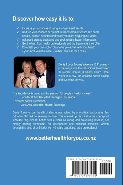 A balanced overview of being healthy, written by a retired pharmacist with forty-years-experience. Denis promotes a holistic (big-picture) approach after a fantastic holistic medical doctor solved his health issues when his orthodox doctor had no answers. The time is now to spread the word on better ways to look after your most valuable asset - your health instead of relying on most doctors who just treat symptoms of diseases with medicines instead of getting to the root-cause. The book covers a wide range of topics including: Why it can be difficult to lose weight. How to ensure you are getting reliable health information. Ways to reduce your chances of dying early. Understanding what a healthy lifestyle means, including how to get the best from your food, health professionals and the treatment they provide. Act now - Do not wait until it is too late.