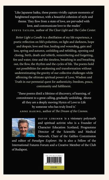 Better Light a Candle is a distillation of my life experience, a poetic reflection on life's polarities, on light and darkness, hope and despair, love and fear, healing and wounding, gain and loss, spring and autumn, unfolding and refolding, opening and closing, birth, death and rebirth, remembering and forgetting, fire and water, time and the timeless, breathing in and breathing out, the flow, the rhythm and the cycles of life. The poems hold out possibilities for awakening and transformation without underestimating the gravity of our collective challenges while affirming the ultimate spiritual power of Love, Wisdom and Truth in our perennial quest for authenticity, freedom, peace, community and fulfilment.