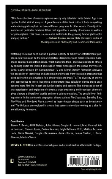 Acknowledgments Foreword Martin Shuster Introduction: Television: What is it Good For? Steven A. Benko Chapter One: Sleeping with Fishes and Talking with Horses: Animality, Identity, and Vegetarianism in The Sopranos H. Peter Steeves Chapter Two: The Bigger the Lie, the More They Believe: Morality and Ethics in The Wire John Hillman Chapter Three: The Two Walters: Walt Whitman's Poetry and the Moral Vision of Breaking Bad Douglas Rasmussen Chapter Four: Check Your Settings: Change to a Democratic Framework for Feminist Subtitles Leigh Kellmann Kolb Chapter Five: "The Lord of War and Thunder": The Morality of Nemesis and Retributive Justice within Justified James L. Shelton Chapter Six: Law and Loyalty in Hellcats Matt Hummel Chapter Seven: Justice is Served: Bryan Fuller's Hannibal and the Evolution of Cultural Morality Douglas L. Howard Chapter Eight: What Made the Devil Do It? Matilde Accurso Liotta and Martina Vanzo Chapter Nine: Letterkenny: Tolerance Meets Tra