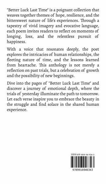 "Better Luck Last Time" is a poignant collection that weaves together themes of hope, resilience, and the bittersweet nature of life's experiences. Through a tapestry of vivid imagery and evocative language, each poem invites readers to reflect on moments of longing, loss, and the relentless pursuit of happiness. With a voice that resonates deeply, the poet explores the intricacies of human relationships, the fleeting nature of time, and the lessons learned from heartache. This anthology is not merely a reflection on past trials, but a celebration of growth and the possibility of new beginnings. Dive into the pages of "Better Luck Last Time" and discover a journey of emotional depth, where the trials of yesterday illuminate the path to tomorrow. Let each verse inspire you to embrace the beauty in the struggle and find solace in the shared human experience.