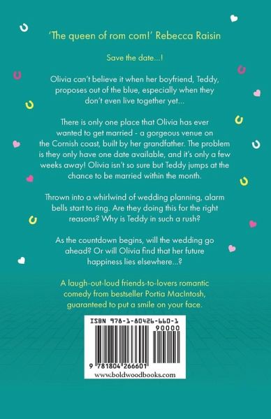 "Olivia can't believe it when her boyfriend, Teddy, proposes out of the blue. She loves him (of course she does!) BUT it does seem sudden, especially when they don't even live together yet... There is only one place that Olivia has ever wanted to get married - a gorgeous venue on the Cornish coast, built by her grandfather. The problem is they only have one date available - and it's only a few weeks away! Olivia isn't so sure about rushing but Teddy jumps at the chance to be married within the month. Thrown into a whirlwind of wedding planning, alarm bells start to ring for Olivia. Are they doing this for the right reasons? Why is Teddy in such a rush? And when he fails to help with any part of the preparations, Olivia must find help elsewhere, with unexpected results... As the countdown begins, will the wedding go ahead? Or will Olivia find that her future happiness lies elsewhere...?"--Provided by publisher.