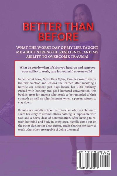 What do you do when life hits you head-on and removes your ability to work, care for yourself, or even walk? In her debut book, Better Than Before, Kamille Coward shares the raw emotion and lessons she learned after surviving a horrific car accident just days before her 30th birthday. Packed with honesty and good-humored conversation, this book is great for anyone who needs to be reminded of their strength as well as what happens when a person refuses to stay down. Kamille is a middle school math teacher who has chosen to share her story to remind others nothing is impossible with God and a heavy dose of determination. After having to re-train her mind and body in every area, Kamille came out on the other side, Better Than Before, and is sharing her story to teach others they are capable of doing the same!