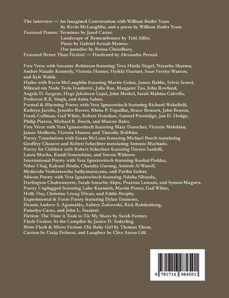 The Interview - An Imagined Conversation with William Butler Yeats by Kevin McLaughlin, and a poem by William Butler Yeats. Featured Poems: Terminus by Jared Carter, Landscape of Remembrance by Tobi Alfier, Piano by Gabriel Awuah Mainoo, and Our paradise by Reena Choudhary. Featured Better Than Fiction! Hardened by Alexandra Persad. Free Verse with Suzanne Robinson featuring Tova Hinda Siegel, Natasha Sharma, Amber Natalie Kennedy, Victoria Hunter, Heikki Huotari, Sean Ferrier-Watson, and Kyle Walsh. Haiku with Kevin McLaughlin featuring Martin Golan, James Babbs, Sylvia Semel, Milorad sin…mehr